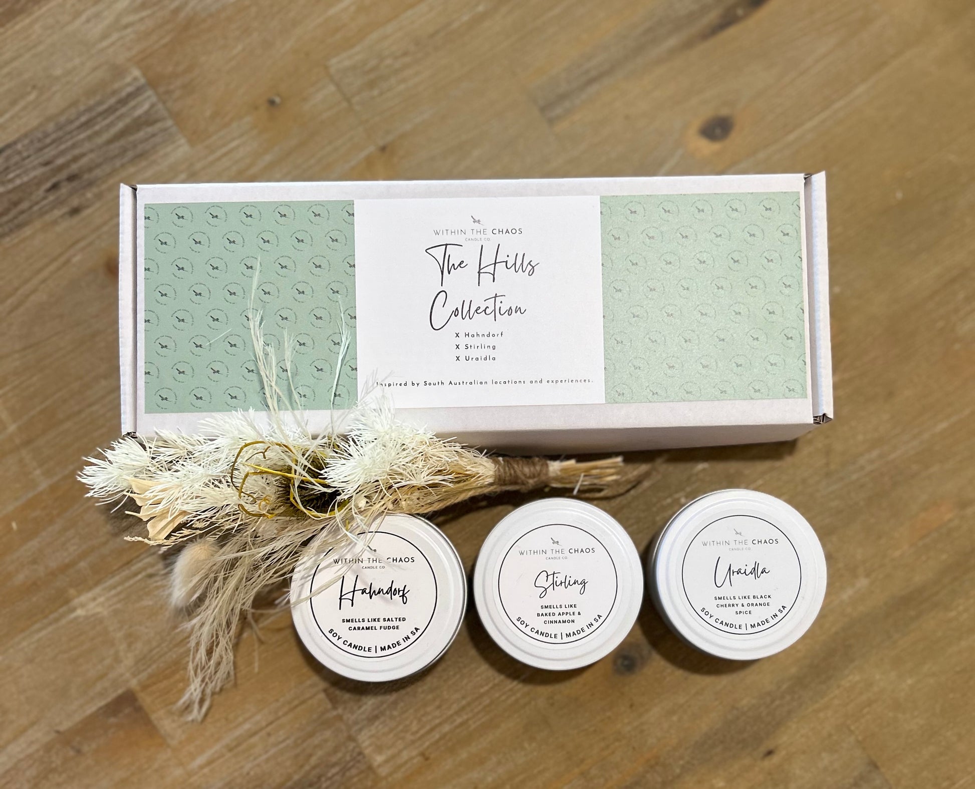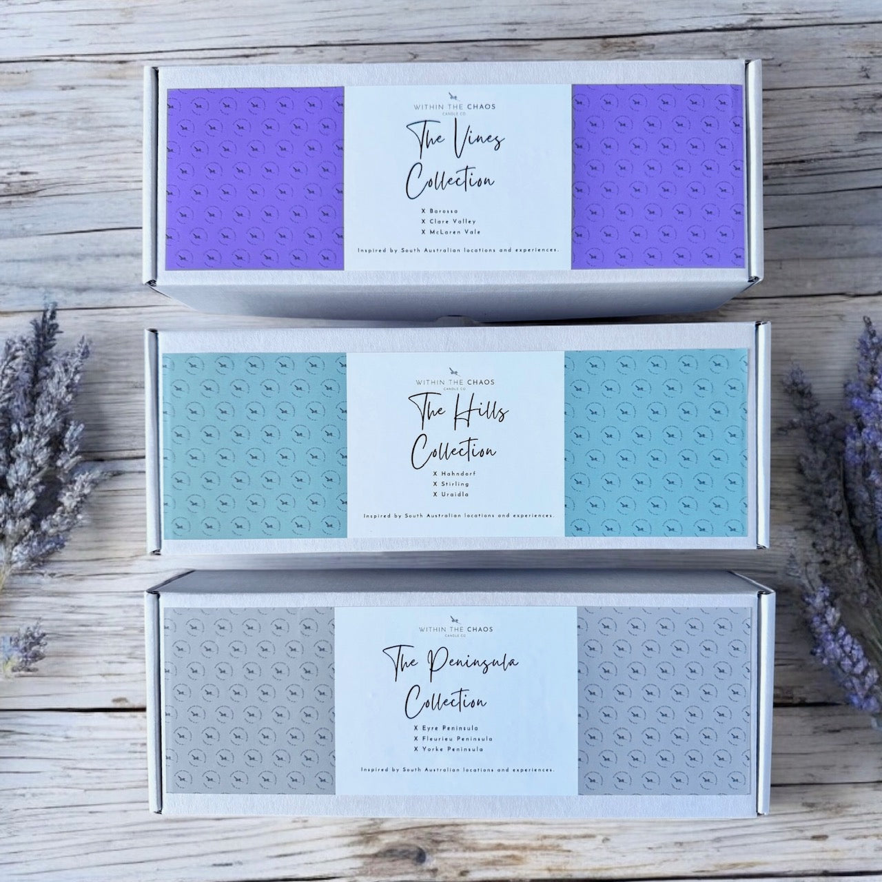 Experience the essence of South Australia with The Collection candle flight. This elegant gift set features three 180g candle tins, each with a 15-hour burn time, inspired by the region’s most beautiful locations – The Peninsula, The Hills, The Vines, The Coast, and The City. A perfect way to explore signature scents that capture the spirit of South Australia.