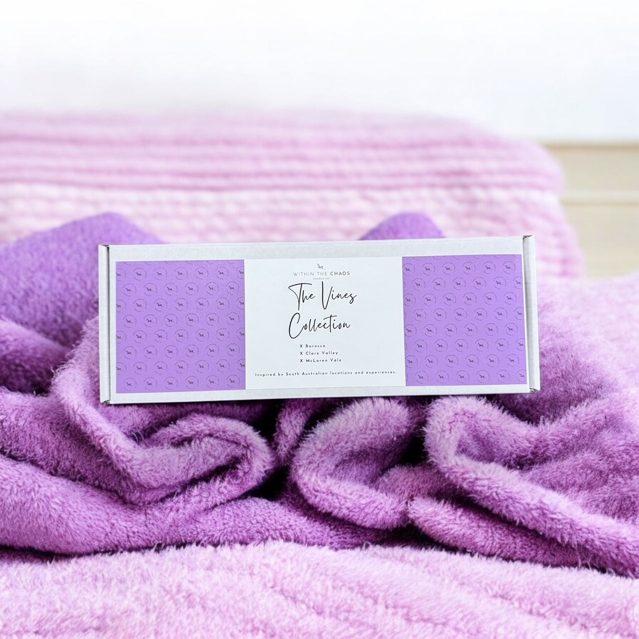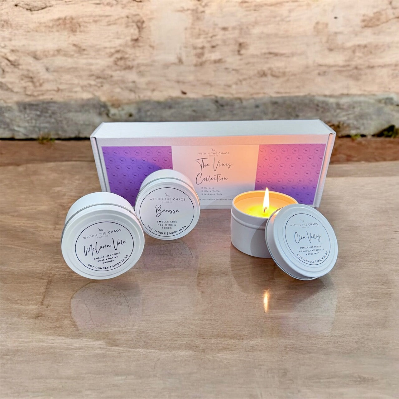 Experience the essence of South Australia with The Collection candle flight. This elegant gift set features three 180g candle tins, each with a 15-hour burn time, inspired by the region’s most beautiful locations – The Peninsula, The Hills, The Vines, The Coast, and The City. A perfect way to explore signature scents that capture the spirit of South Australia.